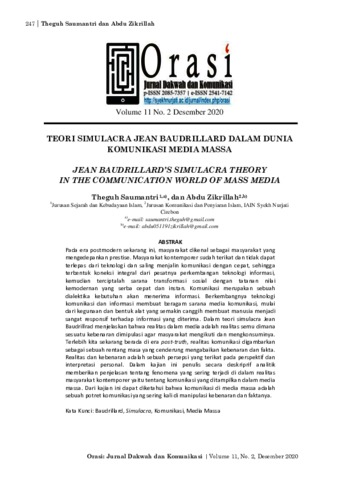 Theguh Saumantri, and Abdu Zikrillah, (2020) TEORI SIMULACRA JEAN BAUDRILLARD DALAM DUNIA KOMUNIKASI MEDIA MASSA. Orasi : Jurnal Dakwah dan Komunikasi, 11 (2). pp. 274-260. ISSN 2541-7142