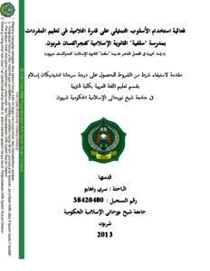 :سري راهايو الأسلوب التعليمي هو عنصر من عناصر العملية التعليمية، و الأسلوب التمثيلي إحدى الأساليب فى تعليم اللغة الأجنبية. والأسلوب التمثيلي هو الأسلوب حيث يعرض المدرس شيئا حتى يستطيع التلاميذ ملاحظة واستماع وخبرة العملية التي يعرض عليه المدرس. أن الأسلوب التمثيلي يمكن استخدامها لتعليم المفردات لتسهيل فهم ومذاكرة المعنى. وجدت الباحثة من البحث التمهيدي أن قدرة التلاميذ على المفردات التي تؤخذ من جميع التقاوم على المدى الدراسي فى تعلم اللغة العربية بمدرسة "سلفية" الثانوية الإسلامية كنجراكسان شربون يدلّ على ناقص والتلاميذ يتعلمون بدون اجتهاد لذلك ستجرب الباحثة الأسلوب التمثيلي فى البحث التجريبي لمعرفة المقارنة بين الفصل التجربي وفصل المراقبة. الأهداف من هذا البحث هو ( 1) لمعرفة قدرة التلاميذ فى فرقة المراقبة بدون استخدام الأسلوب التمثيلي ( فى تعليم المفردات ( 2) لمعرفة قدرة التلاميذ فى فرقة التجربة باستخدام الأسلوب التمثيلي فى تعليم المفردات ( 3 لمعرفة فعالية استخدام الأسلوب التمثيلي على قدرة التلاميذ فى تعليم المفردات بمدرسة "سلفية" الثانوية الإسلامية كنجراكسان شربون. طريقة البحث فى هذه الرسالة هي تجريبية يعني بحث فعالية استخدام الأسلوب التمثيلي على قدرة التلاميذ في تعليم المفردات. والزمرة في هذا البحث هو جميع التلاميذ بمدرسة "سلفية" الثانويةكنجراكسان شربون بعدد 107 تلميذا والمثال يعني الفصل العاشر أو الفصل العاشر ب وعددهم 30 تلميذا. وتحليل البيانات بتجربة اللزوم و .T-Test تجربة المتجانس وتجربة الفرضية بالرموز اختبار وطريقة جمع الحقائق الذي يستخدم في هذا البحث هو طريقة الملاحظة المباشرة وطريقة المقابلة الشخصية والاستفتاء والامتحان. نتائج البحث فى هذه الرسالة يعرف نتيجة الفصل العاشر فى فرقة المراقبة قيمة المعدلة فى الامتحان thitung اللاحقى فهي 9،267 . وأما للفصل التجربي يحصل على معدل الامتحان اللاحقى فهي 13،267 . وأما مقبولا، وهذا بمعنى وجود الفعالية الدلالية استخدام Ha مردودا و HO 4،396 ) أي < 2،145) <ttabel الأسلوب التمثيلي على قدرة التلاميذ فى تعليم المفردات بمدرسة "سلفية" الثانوية الإسلامية كنجراكسان شربون.