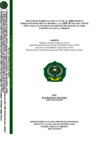 Puji Rahayu Maulida NIM : 1411110149 “Pengaruh Pembinaan Baca Tulis Al-Qur’an (BTQ) terhadap Kemampuan Membaca Al-Qur’an secara Tartil Siswa Kelas X di Sekolah Menengah Kejuruan (SMK) Pariwisata Kota Cirebon” Pada pengajaran tingkat Sekolah Menengah Kejuruan (SMK), pengajaran al-Qur’an masih sangat jarang ditemukan, walaupun ada secara minoritas. Tidak dipungkiri banyak siswa di Sekolah Menengah Kejuruan (SMK) notabene dari mereka kurang memahami al-Qur’an, terlebih dalam hal membaca al-Qur’an secara tartil. Dimana bobot pengajaran pendidikan agama tidak seimbang, lebih didominasi oleh mata pelajaran umum. Tujuan Penelitian ini adalah untuk memperoleh data tentang pengaruh pembinaan baca tulis al-Qur’an (BTQ), data tentang kemampuan membaca al- Qur’an secara tartil, dan data tentang pengaruh pembinaan Baca Tulis al-Qur’an (BTQ) terhadap kemampuan membaca al-Qur’an secara tartil siswa kelas X di Sekolah Menengah Kejuruan (SMK) Pariwisata Kota Cirebon. Berkaiatan dengan hal ini, pengetahuan murid terbatas pada pengetahuan ilmu tajwid dan dalam pelaksanaan terbatas untuk membaca secara fasih dan tartil. Dalam pembinaan ini sangat penting diberikan kepada siswa Sekolah Menengah Kejuruan (SMK), dikarenakan masa remaja membutuhkan pembinaan dan pengarahan agar ia dapat berakhlak mulia yang diamalkan baik di lingkungan sekolah maupun di lingkungan masyarakat. Penelitian ini menggunakan pendekatan teoritis dan empirik atau lapangan. Sumber data dikumpulkan melalui observasi, wawancara, dokumentasi, tes serta angket. Dalam penelitian ini mengambil sebagian dari populasi karena siswa kelas X berjumlah lebih dari 100 siswa. Jumlah siswa yang dijadikan sampel dalam penelitian ini adalah 30 siswa dari 129 siswa pada kelas X di Sekolah Menengah Kejuruan (SMK) Pariwisata Kota Cirebon. Pengaruh pembinaan Baca Tulis al-Qur’an (BTQ) sebagai variabel x sebesar 81,08% berada pada interval 75%-100% (Baik). Kemampuan membaca al-Qur’an secara tartil sebagai variabel y sebesar 81,16% berada pada interval 75%-100% (Baik). Pengaruh pembinaan Baca Tulis al-Qur’an (BTQ) terhadap kemampuan membaca al-Qur’an secara tartil siswa kelas X di Sekolah Menengah Kejuruan (SMK) Pariwisata kota Cirebon (variabel xy) adalah cukup karena angka indeks korelasi product moment