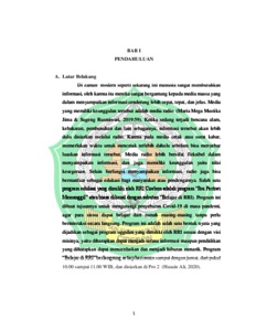 ABSTRAK MANAJEMAN KOMUNIKASI RRI CIREBON PADA PROGRAM “BELAJAR DI RRI” LIVE STREAMING YOUTUBE UNTUK MENINGKATKAN JUMLAH PENONTON DI ERA DIGITAL. Nur Nazmi Laela 1708302103 Di masa pandemi Covid-19 ini, dimana proses belajar tatap muka di sekolah dilarang oleh pemerintah demi mecegah penyebaran Covid-19. Oleh sebab itu, RRI seluruh Indonesia termasuk RRI Cirebon membuat program belajar melalui live streaming youtube. Program tersebut adalah program “Ibu Pertiwi Memanggil” atau biasa dikenal dengan sebutan “Belajar di RRI”. Program ini dibuat dengan tujuan agar para siswa tetap mendapatkan haknya untuk belajar meskipun tidak dilaksanakan secara tatap muka. Berdasarkan latar belakang masalah yang sudah dipaparkan, maka pertanyaan yang diajukan oleh peneliti yaitu (1) Bagaimana perencanaan manajemen komunikasi RRI Cirebon pada program “Belajar di RRI” live streaming youtube untuk meningkatkan jumlah penonton di era digital? (2) Bagaimana penerapan manajemen komunikasi RRI Cirebon pada program “Belajar di RRI” live streaming youtube untuk meningkatkan jumlah penonton di era digital (3) Bagaimana upaya peningkatan jumlah penonton RRI Cirebon pada program “Belajar di RRI” live streaming youtube di era digital (4) Bagaimana tantangan yang dihadapi RRI Cirebon pada program “Belajar di RRI” live streaming youtube untuk meningkatkan jumlah penonton di era digital. Penelitian ini bertujuan (1) Untuk mengetahui perencanaan manajemen komunikasi RRI Cirebon dalam program “Belajar di RRI” live streaming youtube untuk meningkatkan jumlah penonton di era digital. (2) Untuk mengetahui penerapan manajemen komunikasi RRI Cirebon dalam program “Belajar di RRI” live streaming youtube untuk meningkatkan jumlah penonton di era digital (3) Untuk mengetahui peningkatan jumlah penonton RRI Cirebon dalam program “Belajar di RRI” live streaming youtube di era digital. (4) Untuk mengetahui cara RRI Cirebon menghadapi tantangan digital dalam manajemen komunikasi pada program siaran “Belajar di RRI” live streaming youtube untuk meningkatkan jumlah penonton di era digital. Metodologi penelitian yang digunakan adalah jenis penelitian kualitatif dengan pendekatan studi kasus. Sumber data penelitiannya menggunakan sumber data primer dan sumber data sekunder. Tenik pengumpulan data penelitian menggunakan observasi, wawancara mendalam, dan dokumentasi. Kemudian untuk teknis analisis data yang digunakan ialah dengan cara reduksi, penyajian data, dan kesimpulan data. Hasil penelitian ini menujukan bahwa: (1) perencanaan manajemen komunikasi RRI Cirebon pada program “Belajar di RRI” dengan menentukan sekolah, guru, audiens, media, jadwal, materi, dan pembagian kerja. (2) penerapan manajemen komunikasi RRI Cirebon pada program siaran “Belajar di RRI” melalui 3 tahap yaitu organizing, actuating, controlling. (3) Usaha dalam meningkatkan jumlah penonton RRI Cirebon diantaranya membuat konten menarik dan sesuai kebutuhan, menyusun pola siaran dan mebuat laporan, sumber daya yang memadai, dan promosi. (4) tantangan yang dihadapi RRI Cirebon ditengah kemajuan teknologi yang semakin pesat seperti siaran radio melalui live streaming youtube dan membuat aplikasi RRI Play Go dan RRI Net. Kata Kunci: Manajemen Komunikasi, Media Digital, Radio