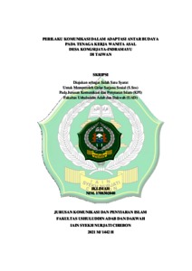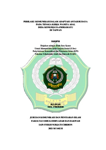 ABSTRAK PERILAKU KOMUNIKASI DALAM ADAPTASI ANTAR BUDAYA PADA TENAGA KERJA WANITA ASAL DESA KONGSIJAYA-INDRAMAYU DI TAIWAN IKLIMAH NIM. 1708302040 Penelitian ini dilatar belakangi dari adanya pelonjakkan yang tinggi terhadap jumlah TKW yang bekerja di Taiwan yang berasal dari Indramayu-Jawa Barat, sebagai asisten rumah tangga. Salah satu desa yang cukup banyak warganya memilih menjadi TKW terdapat di desa Kongsijaya-Indramayu, karena antara Indonesia dan Taiwan pasti terdapat perbedaan, baik bahasa, tradisi, kebiasaan dll. Maka para TKW harus melakukan adaptasi di Taiwan. Pertanyaan penelitian yang diajukan penulis yaitu: 1) Bagaimana perilaku komunikasi verbal dalam adaptasi antar budaya TKW asal Indramayu di Taiwan. 2) Bagaimana perilaku komunikasi nonverbal dalam adaptasi antar budaya TKW asal Indramayu di Taiwan. 3) Bagaimana adaptasi yang dilakukan TKW asal Indramayu dalam mengatasi hambatan komunikasi antar budaya dengan orang Taiwan. Penelitian ini bertujuan untuk mengetahui perilaku komunikasi verbal dan nonverbal, serta adaptasi yang dilakukan TKW asal Indramayu dalam mengatasi hambatan komunikasi antar budaya dengan orang Taiwan. Penelitian ini menggunakan jenis penelitian kualitatif, dengan menggunakan pendekatan studi kasus. Menggunakan dua sumber data, primer dan sekunder, dengan teknik analisis data yaitu studi kasus menurut Stake. Adapun untuk teknik pengumpulan datanya menggunakan metode observasi, wawancara dan dokumentasi. Hasil penelitian didapatkan perilaku komunikasi verbal yang dilakukan oleh para TKW di Taiwan adalah penggunaan bahasa lisan dengan beberapa bahasa: Mandarin, Taiwan, Inggris, dan Indonesia sesuai dengan partner komunikasinya. Sedangkan perilaku komunikasi nonverbal yang dilakukan adalah penggunaan jenis pesan kinesik atau gerak tubuh dan jenis pesan paralinguistik. Para TKW melakukan beberapa tahapan dengan menggunakan 4 fase dalam teori culture shock dalam mengatasi hambatan komunikasi antar budaya: 1) Fase Perencanaan: para TKW melakukan perencanaan seperti apa saja yang perlu disiapkan sebelum berangkan ke Taiwan. 2) Fase Honeymoon: para TKW sangat antusias untuk bekerja di Taiwan setelah mendapatkan segala informasi positif mengenai negara Taiwan. 3) Fase Frustation: para TKW mulai mengalami ketidaksesuaian dengan apa yang mereka bayangkan baik mengenai pekerjaaan, kendala bahasa, cuaca dll. 4) Fase Readjusment dan Resolution: para TKW mulai menata kembali apa yang menjadi tujuan mereka bekerja, sering berkomunikasi dengan keluarga adalah upaya mereka dalam mengatasi segala hambatan. Kata kunci: Perilaku Komunikasi, Culture Shock, Adaptasi Antar Budaya, TKW di Taiwan