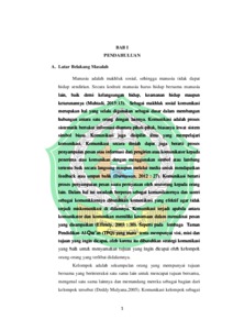 ABSTRAK ANISAH, Nim:1708302090 “STRATEGI KOMUNIKASI USTADZAH DALAM MENINGKATKAN KEMAMPUAN MEMBACA AL-QUR’AN SANTRI DI TPQ AL-MAUNAH DESA KEPUH KECAMATAN PALIMANAN KABUPATEN CIREBON”. Penelitian ini dilatar belakangi oleh kemampuan membaca Al-Qur’an santri di TPQ Al-Maunah Desa Kepuh Kecamatan Palimanan Kabupaten Cirebon, dan hal ini tentu melibatkan seorang ustadzah yang mengajar. Strategi komunikasi yang digunakan oleh ustadzah dalam menyampaikan materi pembelajaran akan berpengaruh terhadap peningkatan kemampuan santri dalam membaca Al-Qur’an. Penelitian ini bertujuan untuk mengetahui strategi komunikasi yang digunakan oleh ustadzah untuk meningkatkan kemampuan membaca Al-Qur’an santri di TPQ Al-Maunah Desa Kepuh Kecamatan Palimanan Kabupaten Cirebon. Disini peneliti menggunakan teori tentang strategi komunikasi pembelajaran untuk mengetahui bagaimana penerapan strategi komunikasi yang diterapkan di TPQ Al-Maunah dan melihat apakah strategi yang dilakukan sudah sesuai dan efektif untuk meningkatkan kemampuan membaca Al-Qur’an santri atau belum. Adapun manfaat dari penelitian ini yaitu dapat menambah wawasan bagi penulis dalam bidang strategi komunikasi. Metode penelitian yang digunakan oleh peneliti dalam penelitian ini adalah menggunakan jenis penelitian Kualitatif study kasus dengan teknik pengumpulan data yaitu (1) observasi; (2) wawancara secara mendalam; dan (3) dokumentasi. Penelitian ini dilaksanakan di TPQ Al-Maunah desa Kepuh kecamatan Palimanan kabupaten Cirebon. Hasil dari penelitian ini yakni sebagai berikut: strategi yang digunakan ustadzah dalam pembelajaran santri dikelas cukup bagus dan efektif yakni: (1) Guru Sebagai Penceramah; (2) Guru Sebagai Moderator; (3) Guru Sebagai Pembimbing; (4) Guru Sebagai Menejer; (5) Guru Sebagai Kordinator Dan Innovator. Dengan penerapan strategi yang baik dan efektif maka kemampuan membaca Al-Qur’an santri pun dapat meningkat dan proses pembelajaran Al- Qur’an pun bisa berjalan secara efektif. Kata kunci: Baca Al-Qur’an, Strategi Komunikasi, Ustadzah.