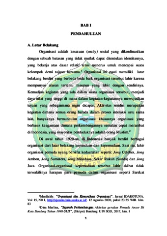 ABSTRAK Khairul Ummam, 1608301052. Sejarah dan Perkembangan Gerakan Pemuda Ansor di Kecamatan Tanjung Brebes 2012-2019. Skripsi Jurusan Sejarah Kebudayaan Islam. Fakultas Ushuludin Adab dan Dakwah. IAIN Syekh Nurjati Cirebon, 2021. Sejalan dengan sejarah dan perkembangan GP Ansor di Kecamatan Tanjung maka lahirlah organisasi kepemudaan yang berperan penting dalam melahirkan pemuda-pemuda yang berjiwa nasionalis dan religius. Tujuan penelitian yang dibahas dalam penelitian ini adalah mengetahui latar belakang berdirinya GP Ansor di Kecamatan Tanjung dan mengetahui perkembangan GP Ansor dalam melestarikan kultur keagamaan Ahlussunah wal Jama’ah. Dalam penyusunan skripsi ini penulis menggunakan metode penelitian sejarah yang meliputi heuristik, interprestasi, verifikasi dan historiografi. Selain itu penulis juga menggunakan pendekatan library reseach atau penelitian kepustakaan dan penelitian lapangan dengan sejumlah narasumber, sehingga dapat menyajikan tulisan yang mudah dipahami. Adapun hasil dari penelitian di atas Pertama, latar berdirinya GP Ansor di Kecamatan Tanjung Brebes tidak lepas dari figur KH. Abdul Karim Zawawi yang menginginkan agar organisasi Nahdlatul Ulama mempunyai penerus dari kalangan anak muda. Sehingga pada tahun 1984 KH. Abdul Karim Zawawi beserta ulama muda dari berbagai daerah di wilayah Tanjung kemudian mengadakan pertemuan bersama guna mewujudkan suatu organisasi pemuda yang bervisi kebangsaan dan keagamaan yaitu GP Ansor. Kedua, GP Ansor di Kecamatan Tanjung memiliki peranan yang sangat penting dalam mengembangkan dan melestarikan kultur ke-agamaan di wilayah Tanjung seperti diadakan acara pengajian, penguatan Aqidah Ahlussunah wal Jama’ah dan dakwah Islam Rahmatan Lil a’alamin yang diadakan setiap satu bulan sekali keliling ranting dan berziarah ke makam-makam waliyullah di sekitar wilayah Brebes seperti makam Pangeran Angkawijaya (Losari), makam Syeikh Ahmad Badawi (Ketanggungan), makam Syekh Junaedi (Randusanga Wetan). Kata Kunci: Sejarah, Perkembangan,GP Ansor, Kecamatan Tanjung Kabupaten Brebes