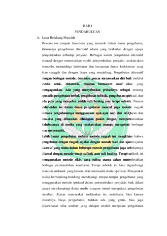 ABSTRAK Amril Huda Musyadad 1414331001. Konsep Pengobatan Kelompok Ruqyah Di Desa Bojongkulon(Perspektif Terapi Sufistik) Dewasa ini nampak fenomena yang menarik dalam dunia pengobatan, khususnya pengobatan alternatif islami yang berkaitan dengan upaya penyembuhan terhadap penyakit. dalam dunia pengobatan muncul juga metode ruqyah dimana pengobatannya menggunakan ayat-ayat suci dari Al-Quran dan doa-doa yang dibacakan dihadapan pasien dengan mempertontonkan kehebatanya di media yang seakan-akan mampu mengobati berbagai macam penyakit. Pengobatan melalui metode ruqyah ini mengklaim bahwa pengobatan dengan ruqyah sejalan dengan sunnah rasul dan juga selaras dengan ajaran-ajaran tasawuf dimana dalam ajaran tasawuf mengandung konsep-konsep yang mampu menenangkan jiwa atau ruhaniah manusia, ruhaniah manusia inilah sumber segala spek kehidupan menurut pandangan tasawuf, dan tidak terkecuali juga aspek kesehatan dan pengobatan dalam konsep tasawuf lebih menekankan pengobatan melalui penekanan pada spiritual pasien. Penelitian ini bertujuan untuk : (a) mengetahui dan memahami bagaimana keselarasan pengobatan ruqyah di Desa Bojongkulon dengan terapi sufistik (b) mengetahui dan memahami bagaimana hasil pengobatan Ruqyah di Desa Bojongkulon. Penelitian ini menggunakan metode kualitatif dengan jenis deskriptif analisis atau penelitian studi kasus. Objek penelitian ini adalah pengobatan Ruqyah yang dipraktekkan di desa Bojongkulon dan penerapan konsep tersebut selama proses pengobatan berlangsung. Kerangka teori yang digunakan adalah perspektif terapi sufistik. Teknik analisis data yang dilakukan melibatkan kerangka teori sebagai analisis terkait objek yang diteliti. Hasil temuan dan analisis penelitian menunjukkan bahwa: 1) tahap sebelum pengobatan peruqyah dan pasien berdoa kepada Allah agar menolong dan membantu pengobatan berjalan lancar dengan izin Allah 2) tahap pengobatan menggunakan teknik sentuhan dan teknik tekanan disertai bacaan ayat-ayat al-Quran yang digunakan untuk ruqyah. Setelah tahap tersebut pasien diberikan nasihat dan diluruskan juga akidahnya. Dengan demikian dapat dilihat bahwa terapi ruqyah sangat erat kaitannya dengan tasawuf dimana dalam konteks terapi tasawuf sendiri memiliki cara untuk mengobati penyakit fisik dan psikis. Ruqyah yang dilakukan selama pengobatan merupakan bagian dari terapi sufistik dimana metodenya menggunakan bacaan ayat al-quran dan pemberian nasihat mengenai ketauhidan kepada pasien. Kata Kunci: Ruqyah, Kelompok Ruqyah Desa Bojongkulon, Terapi Sufistik