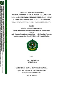 SITI MAEMUNAH “Penerapan Metode Sosiodrama Dan Pengaruhnya Terhadap Hasil Belajar Siswa Pada Mata Pelajaran Sejarah Kebudyaan Islam (SKI ) di Madrasah Tsanawiyah (MTs)YAPIN Kertasemaya’’ Guru dalam menyampaikan materinya lebih mendominankan dengan metode-metode tertentu saja, sehingga siswa terlihat lebih banyak diam dan mendengarkan gurunya menerangkan dan menunggu tugas-tugas yang diberikan kepadanya. Hal ini merupakan salah satu penyebab kurang berkembang potensi minat yang ada pada siswa dan akhirnya berpengaruh juga pada hasil belajar mereka. Salah satu upaya untuk mengatasi masalah tersebut dengan menerapkan metode pembelajaran yang menuntut siswa lebih aktif dalam proses pembelajaran yaitu dengan menerapkan metode sosiodrama sehingga siswa tidak hanya terbatas pada aspek teoritis saja, akan tetapi dapat diterapkan dalam sikap dilingkunganya. Penelitian ini bertujuan untuk Untuk Mengetahui Penerapan Metode Sosiodrama yang dilakukan guru Sejarah Kebudayaan Islam diMTs YAPIN Kertasemaya. Untuk Mengetahui Hasil Belajar Siswa pada Mata Pelajaran Sejarah Kebudayaan Islam diMTs YAPIN Kertasemaya. Untuk Mengetahui pengaruhnya penerapan Metode Sosiodrama terhadap hasil belajar siswa di MTs YAPIN Kertasemaya. Metode sosiodrama yang merupakan penerapannya melalui peragaan atau di modelkan seorang siswa yang sesuai dengan alur dan watak yang sama dengan isi materi yang diajarkan. Bila diterapkan pada mata pelajaran SKI, sekirannya sangat cocok digunakan dalam materi keteladanan. Maka akan dapat meningkatkan hasil belajar siswa, hal ini karena penyesuaian antara metode pembelajaran yang menekankan peragaan lakon dengan materi yang ada dalam mata pelajaran SKI. Pengumpulan data dalam penelitian ini menggunakan teknik-teknik sebagai berikut: wawancara, observasi, tes dan angket, kemudian di analisis dengan menggunakan statistika yaitu dengan menggunakan rumus Korelasi product moment. Dan mengambil sampel yang terdiri dari kelas VIII sebanyak 51 siswa. Hasil penelitian ini adalah Penerapan Metode Sosiodrama tergolong dalam kriteria baik, dengan kualitas nilai rata-rata 43,63 % maka dengan kategori Kurang Baik, hasil Tes Evaluasi belajar siswa diMTs YAPIN Kertasemaya dengan nilai Rata-rata mencapai (74.32) dengan kategori cukup terletak pada rentang 56%-75%. Berdasarkan perhitungan pengaruh antara penerapan metode sosiodrama terhadap Hasil belajar siswa pada bidang studi SKI di MTs YAPIN Kertasemaya memiliki nilai korelasi yang cukup hal ini berdasarkan pada perolehan nilai yang mencapai nilai sebesar 0.478 nilai pada jarak (0.40 - 0.60) pada interpretasi korelasi sedang atau cukup. Kemudian berdasarkan perhitungan, diketahui nilai sebesar 0.478, dan nilai sebesar 0.273 dari perhitungan α = 0.05 dan dk = 51. Jika dibandingkan terlihat > . Dengan demikian yang menyatakan “ ada pengaruh antara Penerapan metode sosiodrama dengan Hasil belajar siswa “ di terima.